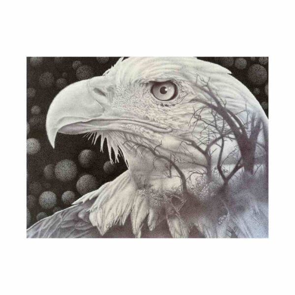 Eagle by Ron is a powerful testament to patience, precision, and perseverance. Created entirely through stippling — a technique that uses thousands of tiny ink dots to form detailed, lifelike imagery — this piece captures the quiet strength and dignity of its subject. Despite living with arthritis, Ron continues to create through the pain, finding both challenge and reward in the process. Incarcerated in North Carolina, he channels resilience and determination into every mark, transforming endurance into art.