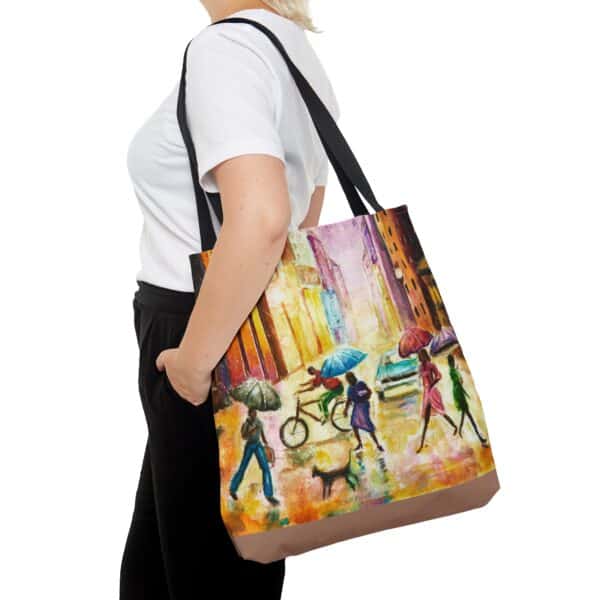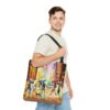 Perfect for the beach, coffee shop, or office, this durable all-over print tote combines art and practicality. Made from 100% polyester with black cotton handles and a laminated interior, it’s built to last and makes a meaningful statement. Available in three sizes: small (13″ × 12″), medium (16″ × 15″), and large (18″ × 17″)—each with a 3.46″ width and 14″ handle height.