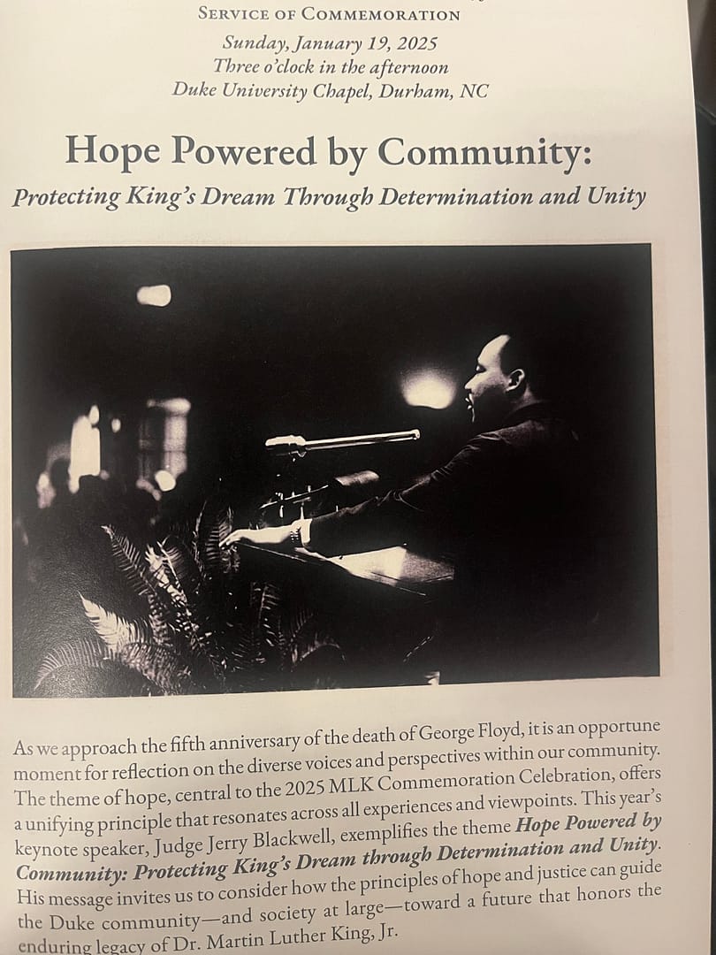 In recent weeks, I attended Duke University’s 2025 Martin Luther King Jr. Service of Commemoration, themed “Hope Powered by Community.” The event was deeply inspiring.